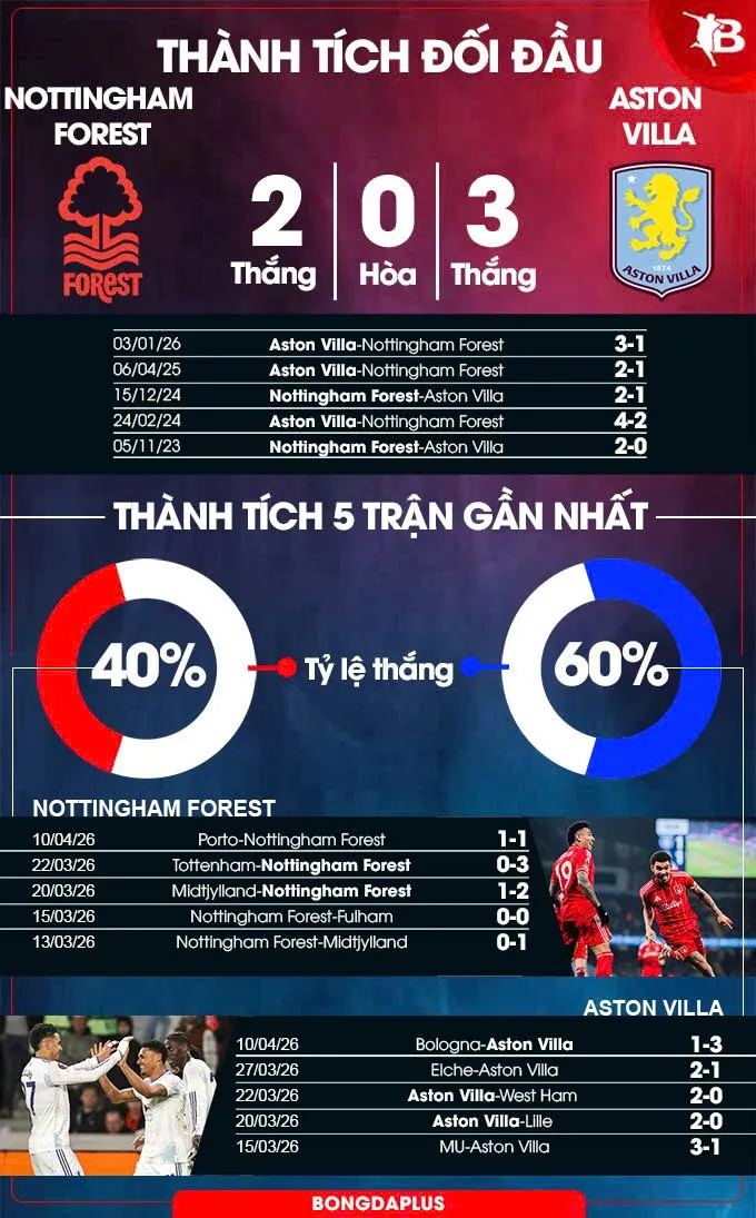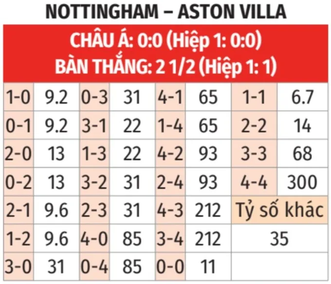 - Tổng bàn thắng chẵn: 7/9 cuộc đối đầu gần đây kết thúc với tổng số bàn thắng là số chẵn. Tỷ lệ tương tự là 6/9 trận của Nottingham Forest và 4/5 trận làm khách gần đây của Aston Villa.